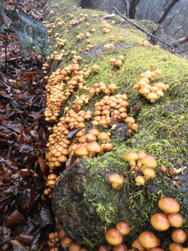 雨の中の山頂で長居する事もなく、早々に立ち去り、何処かで止む事があったら、「そこで、コーヒータイムでも・・」 と言っていたが、車に戻ってからの食事となった。そして、全くないと嘆いていたナメコであったが、それこそ鈴なり状態の倒木との遭遇に全て良しとなった。