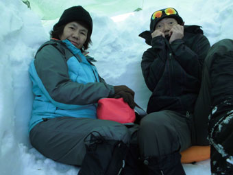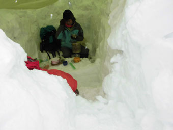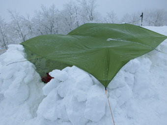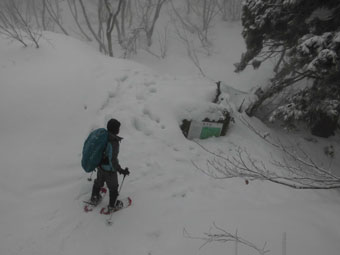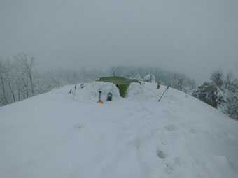 静かな山・神秘的な山とは、このような時をいうのかもしれない。ちょっと、ヤブが煩いが、そんなものと思えば、そうでもないから不思議である。凍っていて沈まないから、予定より早く山頂に着いた。(高落場山) 飲まない私だから、する事がないので、シェルター造りに精出さなくてはならない。背丈程掘っても、地に届かないのであるから、少雪とはいえ、流石五箇山の山と思った。