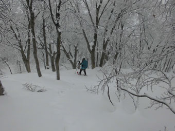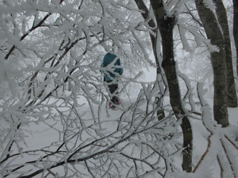 昨日は、沢山の方々が登られたのか至る所に足跡があった。今日の冷え込みで、それが凍っていて、決して歩き易いものではない。その上に新雪が、始めは5cmくらい、上部に行くと10~15cmくらい覆い被さっているのである。視界は決して良くないが、樹木に付いた雪が凍っていて、それは白銀の世界の招待のようなものである。
