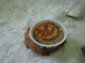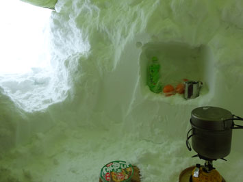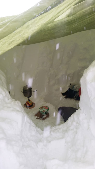 サラサラの固まらない雪だけに、壁を作るのは難しい。それではと、掘って掘って、私の背丈程掘った。雪が降り続いているのだから、タープを架けなければいけない。一人だと、なかなか上手くいかず時間が掛かる。でも、出来てしまえば温かい。私のガスコンロでも、すぐ湯が沸くというもの。たぬきうどんを食べた。コーヒーも飲んだ。