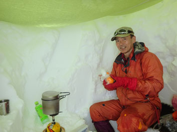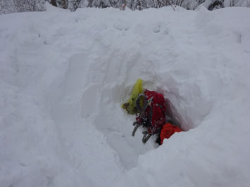 | 山頂の雪量は多く、背丈ほど掘った。 |