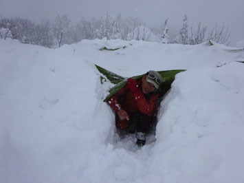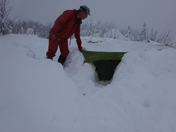 山頂到達時は、吹雪いていた。すぐに引き返すのも手なのである「それでは何しに来たかわからない。」 という私なりの論理があるのです。単独だと写真もなく、悪天では尚更である。昨年もそうであったように、迷わずシェルター造りに精出した。緊急避難というより、そのような事が好きなのである。