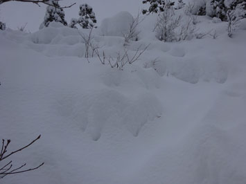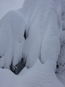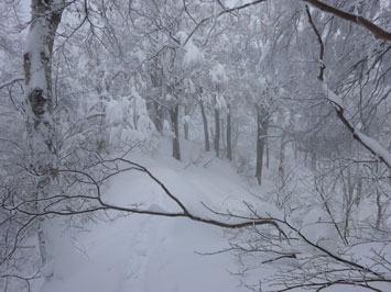 | 山頂手前の樹木。雪が覆い被さっていた。 |