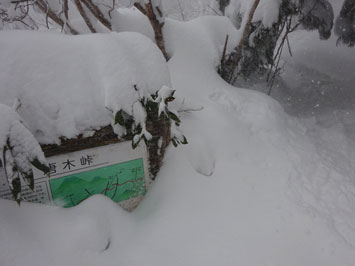 唐木峠まで小一時間掛かってしまった。先のトレースを辿ったのであるが、いろいろ苦労された結果が伺えるものであった。それを嫌うと、深みにハマるので従うのが得策というもの。唐木峠の先は、杉林がなくなるまで、登りやすかったが、ブナ林に入ると雪量が増え、膝ラッセルになってしまった。