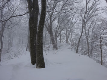 ブナ林を行く。この辺りから、トレースが消え、膝ラッセルとなる。