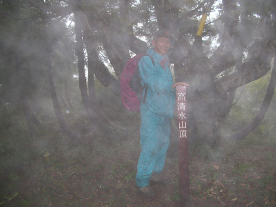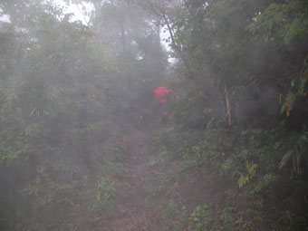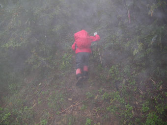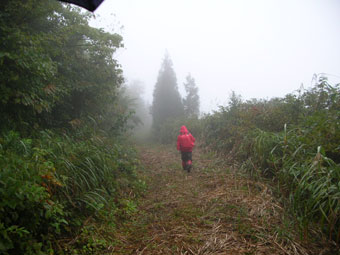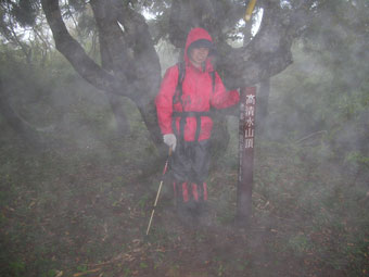 視界が10数メートルの中、一番高い所に辿り着いたと思ってみたが、何の標識もなくGPSで確認してみると、どうも違うような感じであった。恐る恐るその先を下ってみて、登り返すと懐かしい看板と真新しい標柱が立てられていた。その先に道は延びていたが、「明神池」たる所まで行くと、それは、迂回するものでなく、北方面(もしかしたら赤祖父山方面)に延びているように思えた。間違いかもしれないが、雨降る中、視界も悪く、次の用事が待っている私達には、そう余裕の時間はなかった。行ってみれば簡単で、林道からの標高差が100mもないのだから、拍子抜けしてしまうかもしれないが、自分だけの「探検」「冒険」として行って見られると、それなりに征服感が湧くものである。
