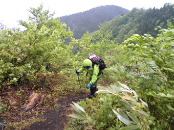 今日は行動食(間食)がないと聞かされていたが、食べるものがないという事は、実に寂しいものである。しかし、「水だけはいっぱいある。」 のであるから、何時間か我慢すればよいだけの事である。「食事をする。」 となって、「山ノ神」が、雨具を上下とも着るとなった事もあり、私は、ちょっとだけ、山頂確認と湿原への雰囲気を探りに、先へ足を伸ばしてみた。