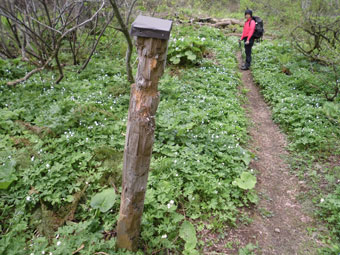 水芭蕉は見頃が既に終わっており、もう少しで、お化けになりそうであった。高清水山の登山道(道宗道)を整備されていたおじさんにその事を話すと、高清水山を越えた所に (どれだけの距離かはっきりしなかったが・・) 湿原があり、縄ヶ池より凄いと聞かされた。