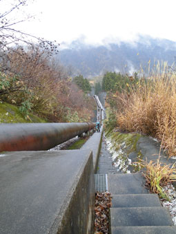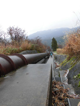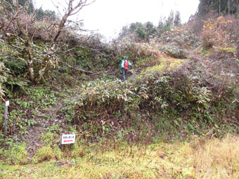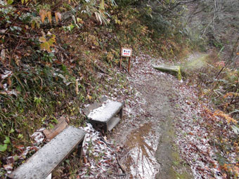 | 送水管を離れ水平道を行く。(まっすぐ行くと三枚滝へ) | すぐにベンチがある所から、左の急登箇所に入る。 |