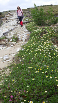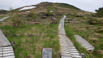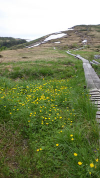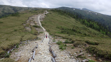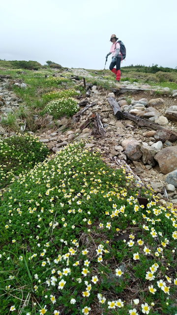 整備中の登山道を歩く、高山植物の再生作業も行われている。きれいになるのだろうが、自然の力には、なかなか勝てずイタチごっこは歴然である。チングルマは、まだ下の方にしか咲いていない。五光岩の先には花はない。夏山になったばかりだから仕方がない。