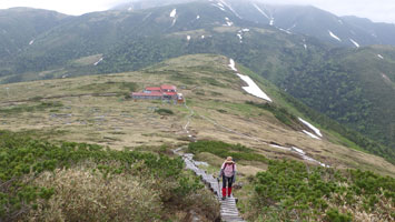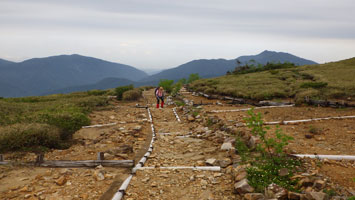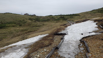樹林帯を抜ければ、チングルマが現れた。ホットする。曇りがちであるが、結構視界は広がっている。雨は降らないと思った。しかし、私の心の中では、北ノ俣岳へも怪しくなって来たように感じる。「山ノ神」は、寝なくても、重い荷を担いでも、執念を漲らせる私には、少々呆れかえっている。