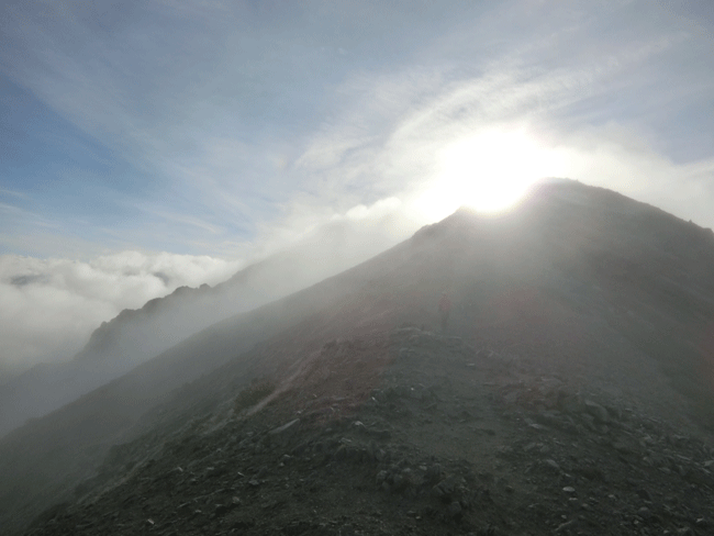 これから向かう稜線に湧き出る雲。 |