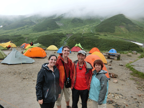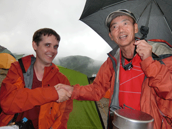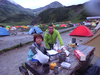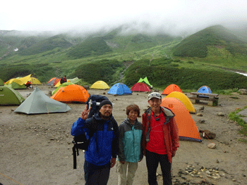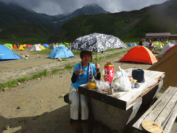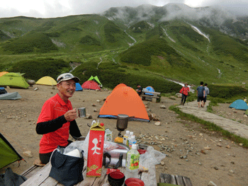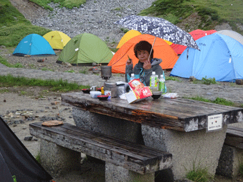 宴に入って、単独行の下津佐氏に声を掛けた。今度は、「お酒飲む?」 とドイツ人の若い夫妻に声を掛けた。お酒は飲まないと言いながら飲んでいった。言葉は通じなかったが、随分楽しかった。それには、語学が堪能な下津佐氏(千葉県在住 80カ国の旅行歴有り)の助けがあったからに他ならない。 そして、剱御前小舎志鷹正博に声を掛けてもらった。「山ノ神」は、覚えてもらっていたと感激していた。何度も雨に見舞われながらの宴。また楽しからずであった。そうして、夜は更けていった。