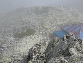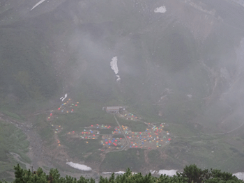 雷鳥とも遭遇したし、復元作業の賜物なのか、ネットの中にチングルマが、かなり蘇っていた。テント場が見えるのであるが、なかなか着かないが、もどかしさはない。テン場に着いたら、また雨となった。聞く所によると、私達が稜線歩きに興じている頃に、相当強い雨が降ったようである。
