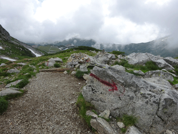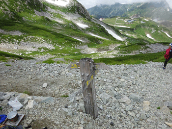 室堂側へちょっと行った所に雷鳥沢への分岐がある。 |