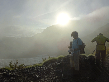 | 別山乗越(剱御前小屋)で陽が昇り始めた。 |