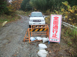 横江集落外れで通行止め。