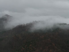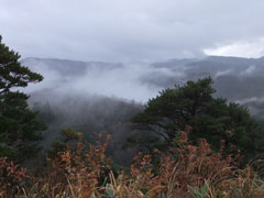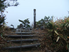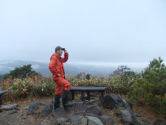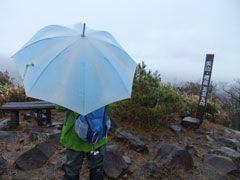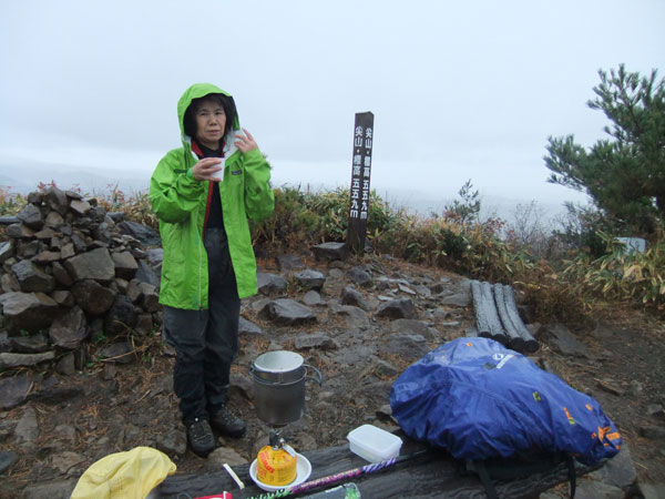 雨の尖山頂上で、低けれど、お山のてっぺんの雰囲気を楽しむ。