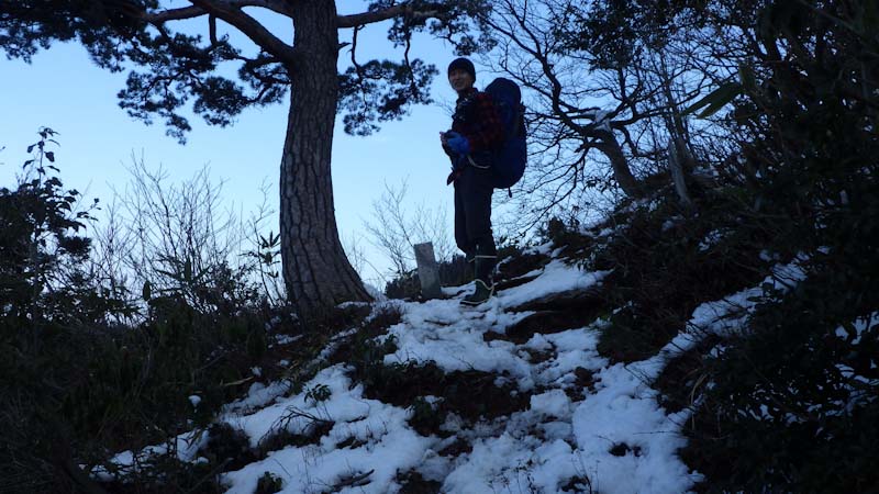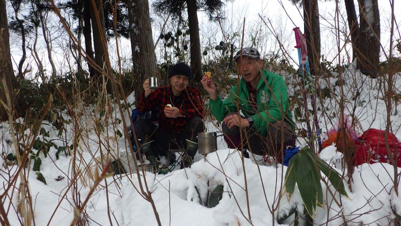 | 再び山頂に戻り、風の当たらぬ小籔で食事ならぬコーヒータイム。 |