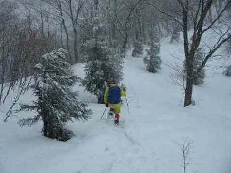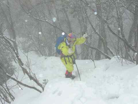 新たな雪が積もった稜線は、心もリフレッシュされるようだが、塔倉山西峰に着いた頃は、降雪が益々強くなり東峰に行く事を諦めた。セルフタイマーで、カメラのシャッターを切るのも、傘を差して準備するほどであった。