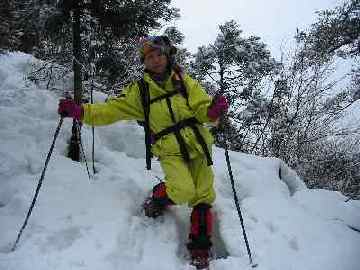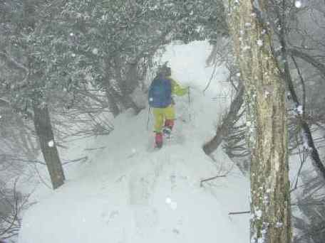 小屋からは、あちこちにトレースがあり、竹と杉を抜けた一番急斜面に取付き、6~7段ある鉄製の階段からは、夏道に付けられたトレースを辿った。