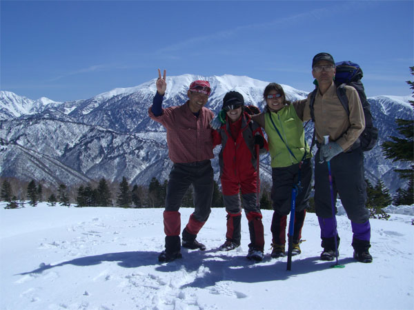 山頂に立てば、真正面に薬師岳や北ノ俣岳が鎮座し、笠ケ岳・乗鞍岳・御嶽山など圧巻である。またまた、シェルターを作り、2本のビールを4人で飲み、暖かいコーヒーなど、山頂の味を楽しんだ。後は、写真を撮りまくったのであるが、ただ呆然と、真っ青な空と真っ白な山々のコントラストに、見入っていた人もあった。