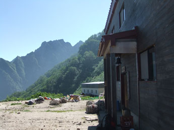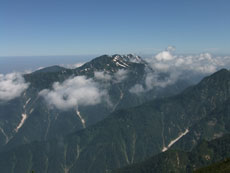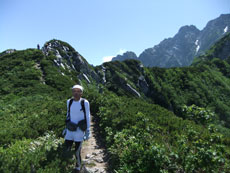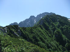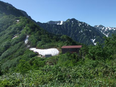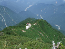 | 早月小屋が小さく見えます。 | 山頂への稜線です。 | 毛勝の山々です。 |