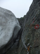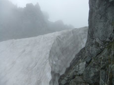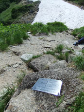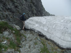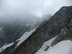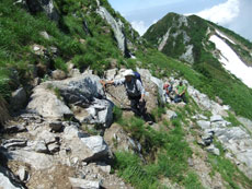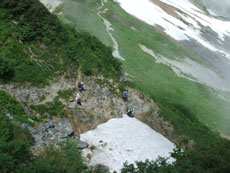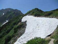 | 柴田さんが、雪渓の上を行かれます。 | 残雪が多くある池ノ谷側です。 | 射水市のH氏に、アドバイスを受けました。 |