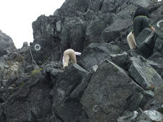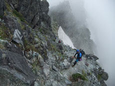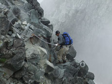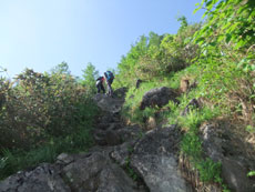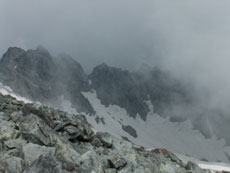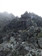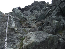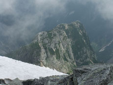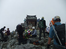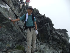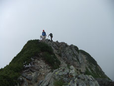 | 山頂にはたくさんの方々がおられました。 | ガスに覆われていますが、八峰です。 | 源治郎尾根です。手前が懸垂場です。 |