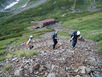 | 剱山荘横の標識。 | 剱山荘から一服剱を目指す。 |