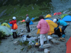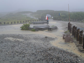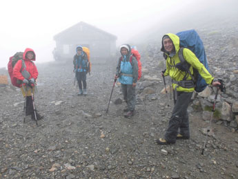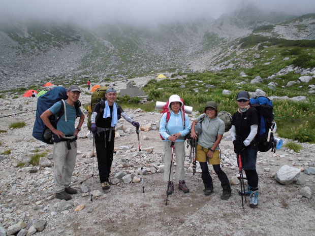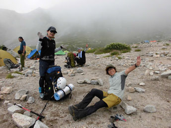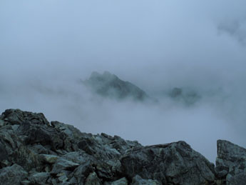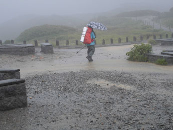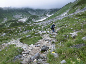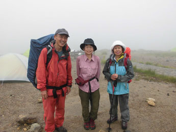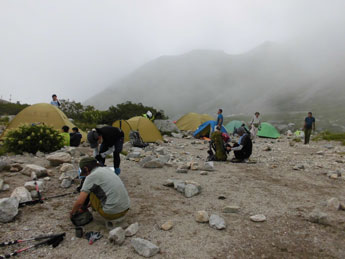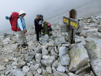 | 剱沢キャンプサイトから剣御前に向かって・・ | 剣御前では、完全に雨になりました。 |