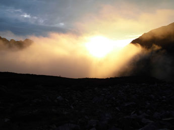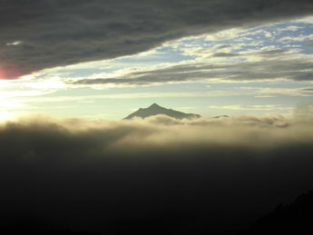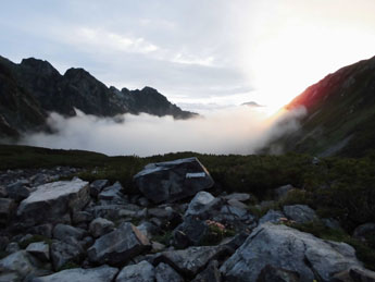 | 「山ノ神」の見送りを受けながら出発です。 | 雲海の上から陽が差して来ました。 |