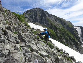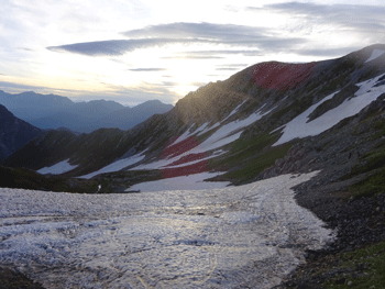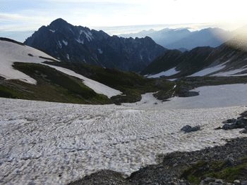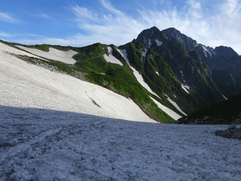 | 長い雪渓をトラバースする。 |