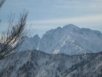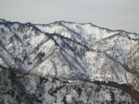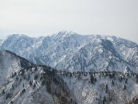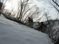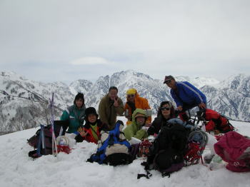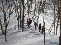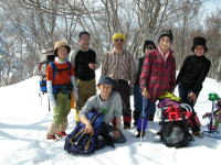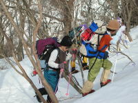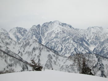 ■3/20 「山ノ神」の友人を含めて総勢7名の土倉山行きになった。誰も土倉山の経験はなかったが、前週「細蔵山行」の折、しっかりルートを頭の中に叩き込んでいたから、取付きさえ問題なければ、後は、一本の尾根を登ればいいのである。大倉山からの稜線に出なくとも、赤谷ノ頭・大熊山・大日岳そして剱岳を眺めながらの快適なルートであった。金沢からやって来た単独行の小豆沢青年とも、山頂まで一緒する事になり、「山の話」を楽しんだ。稜線に飛び出したら、一気に視界が広がり、素晴らしい剱岳や毛勝の山々が目に飛び込んで来た。そこから土倉山頂上までは、5~10分ほどである。広い山頂の展望は素晴らしいのであるが、美味しいご馳走も風当たりには耐え切れず、フードを作った別場所に移動する事になった。山頂では時々メールを頂く「山順さん」から声を掛けられて嬉しい思いをした。その山順さんご一行が、大倉山に足を延ばされた2時間後、予定を変更して我々もそのトレースを追った。小さな雪庇が連続する稜線漫歩は、剱岳・毛勝の山々をイヤと言うほど眺めさせてくれる。、しかし、この先の行程に、美味しい料理を担ぎ上げてくれた堀シェフの体調が悪く、小さな登りでも完全に息を切らすくらいであった事と、土倉山への登りで私がカシミール地図を紛失してしまった事が、チョッピリ不安であった。これまた広い大倉山頂で、最後の大展望を楽しんだ後、本来の大倉山ルートとかけ離れた、先行した山順さん一行のトレースを辿る事にしたのである。山頂で初めてのルートを行く事を小耳に入れてはいたのであるが、なかなか大変なルートであった。幾つものアップダウンを乗越え、雑木の間を掻き分け、林道に出るのに、崖を降りなくてはいけなくなってしまったのである。その地点で真下に見える伊折橋まで標高差200m、時刻も午後5時に迫っていた。先のグループは自分達の思いと違った方向に林道を進んで行ったが、反対方向の林道を進めば、暗くなってデブリを渡らなくてはならないような気がし、地形を総合的に判断して、一気にその斜面を駆け降りる事にした。それが奏効し15分で車の待機場所に辿り着く事が出来た。チラチラした小雪が、車に戻った頃から小雨に変わり、国道8号線に出た頃にはどしゃ降りになり、今日一日の縮図のような気がした。■