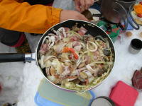 土倉山の広い山頂で、剱岳や毛勝の山々を眺めながらの宴も良いのだが、風が出ると、やっぱりどうしようもない。堀シェフの特性スパゲティを持って、風当たりの少ないシェルターに逃げ込んだ。デザート・コーヒーを嗜んだ後、やっぱり大倉山へ行く事になった時は、もう2時間以上経過していた。