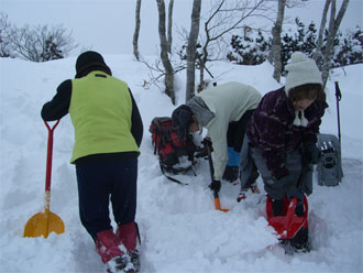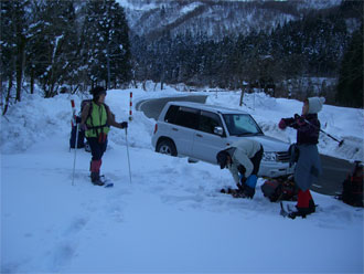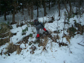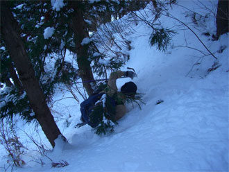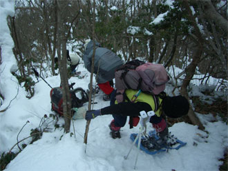 | 雪量が少なくなり、スノーシューを外す。 | 最後の斜面を降りるのに四苦八苦! |