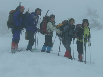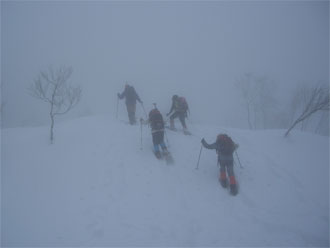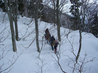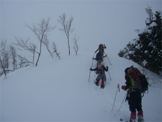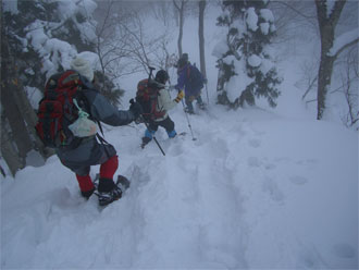 | 午後2時過ぎ、山頂を後にする。 | 急斜面では、スリップする人も・・ |