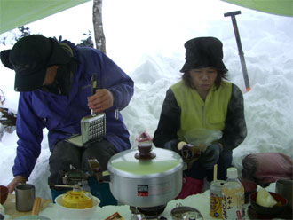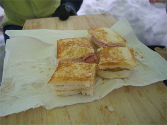 | ガスに覆われた山頂であったが、タープの中は豪華な食事! | 吉尾氏特性のホッとサンド。 |