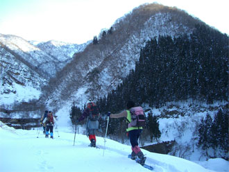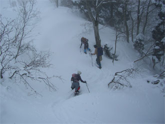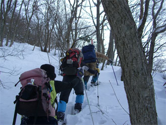 | 鍋増谷と支流が合流する間の斜面が見えて来る。a.m.8:15 | 取り付きは、雪が少なく悪戦苦闘! (a.m.8:30) |