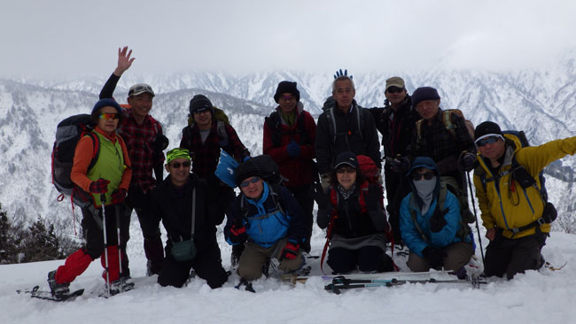 山頂をスタートする前、今一度記念写真となる。 (坂東氏含め12名で・・・) |