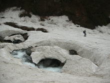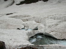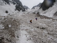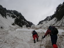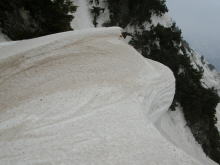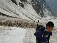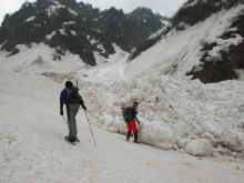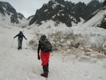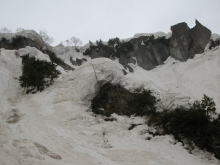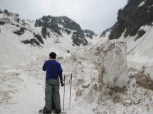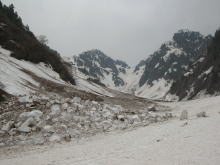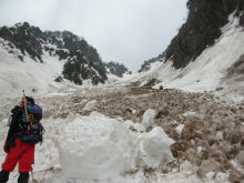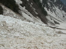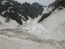 | 残雪の多さにびっくりである | 左側からの雪崩痕は凄まじい | 右側からも・・・ | ブロックのような塊に驚き! |