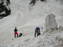 汚れたガタガタの雪渓を行く | 大きく雪渓が切れている | 稜線まで3時間余で行かなければ |