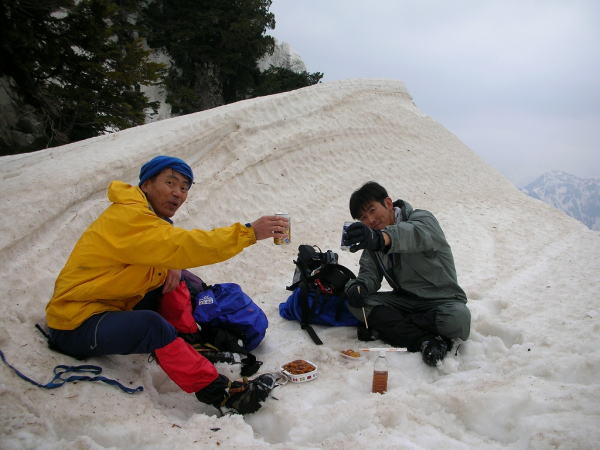 | ウド谷の稜線(コル)でミニミニ宴会 (岩城君撮影) |