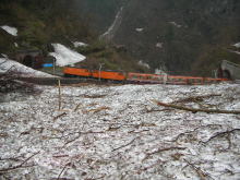 今にも崩落しそうな雪渓横を通過 | トロッコ電車が通過して行く |