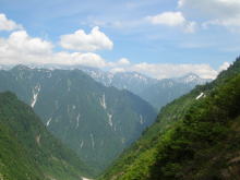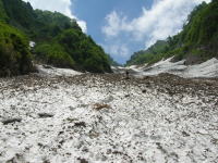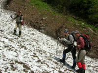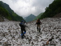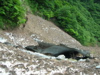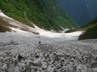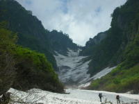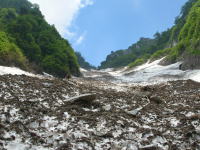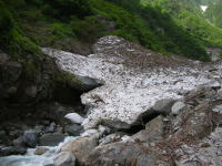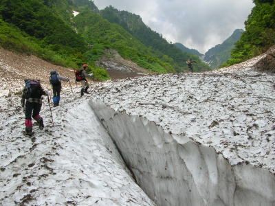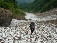 早くも雪渓に大きな亀裂が | 今年は雪が多い。昨年なかった 所に、びっしり残雪があった。 |