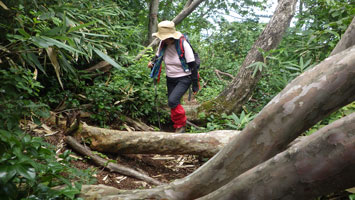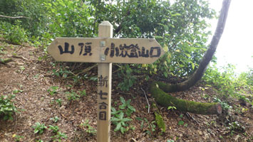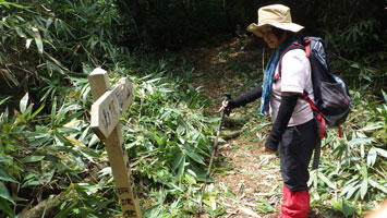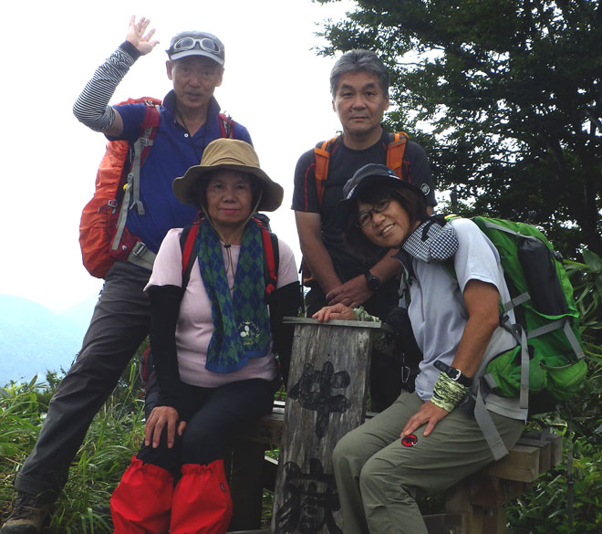 時間が掛かってもゆっくり、転んでは痛いどころか、次行く山にも参加できないのだから、急き立てる事はしなかった。 三角点(最高点)で、別ルートからのマキちゃんと泰三氏に会った。山で会うのは特別であるから、日頃の何でもを、ついつい喋ってしまう。でも、悪い事やイヤな事をいうわけでないから、それはそれは楽しい。私も持ち上げてもらうから楽しいに決まっているが、もう少しで逆転するに違いない。でも、共通の想い出が増えるだけ、それが財産になっていくと確信している。