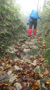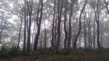 10/20 ならばと午前中に勝負を懸ける事にした。午後から晴れるとの予報であるが、そんな事を言っておれない。時々ワイパーを動かしながら、霧雨の中、白木峰に向かった。往復3時間、山中3時間半の行程で、紅葉が見られるかも懸けであった。大長谷に入ると益々怪しくなっていく空模様であったが行くしか無いと思った。