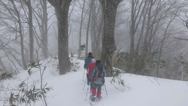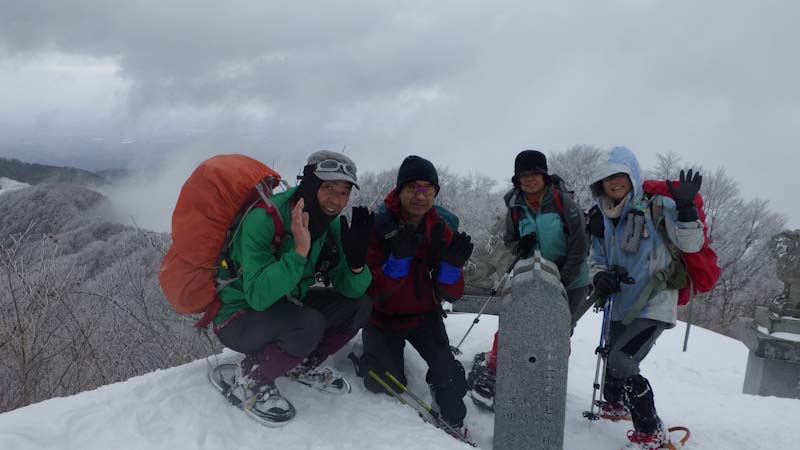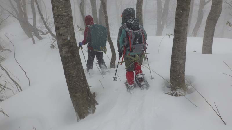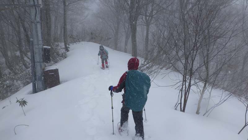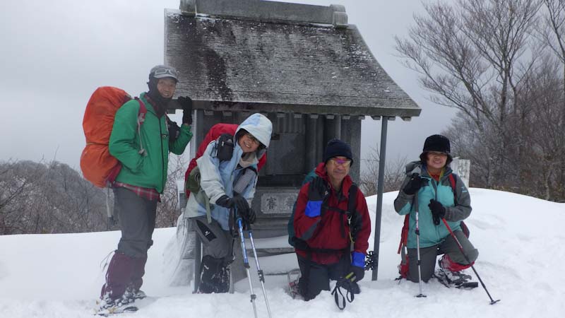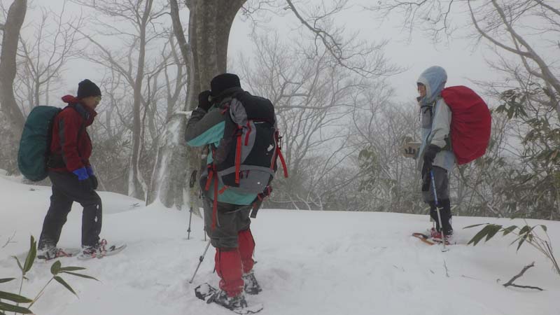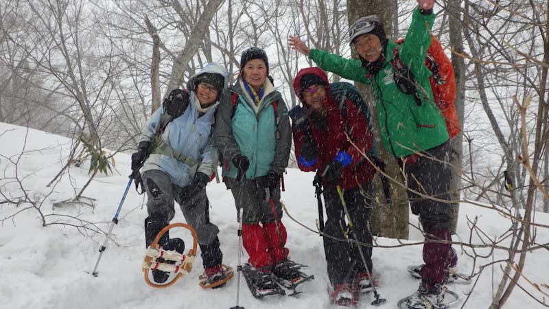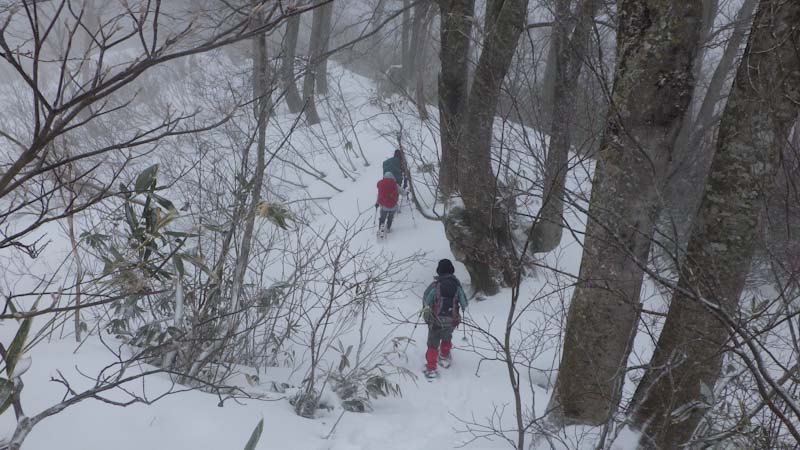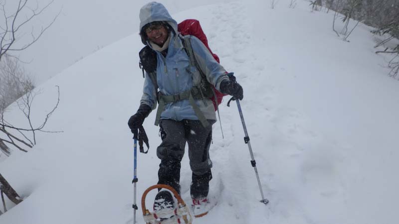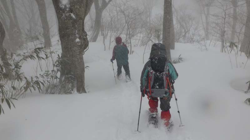 2/23 やはり山は雪だった。時には強く降ったりした。雪量の少なさは歪めないが、それでも雪山・冬山の雰囲気を充分に楽しんで来ました。 (私に合わせてくれた岩城君・マキちゃんに感謝!) 6合目からは、スノーシューでもカンジキでも充分使えます。