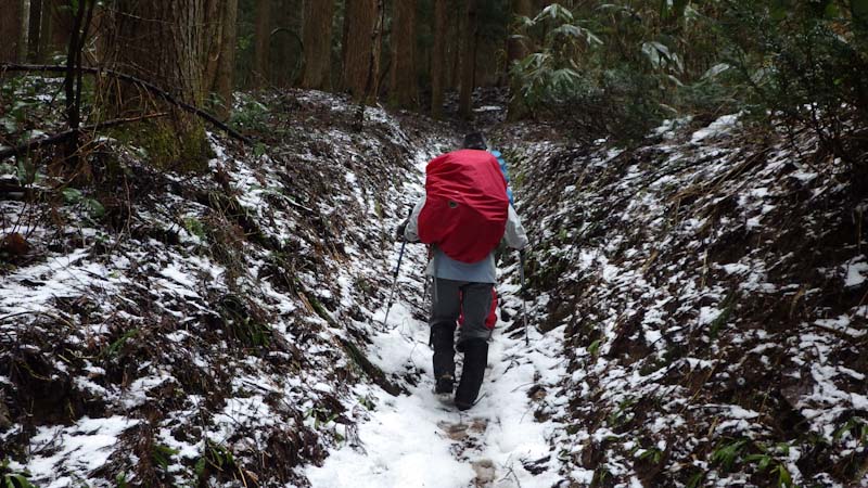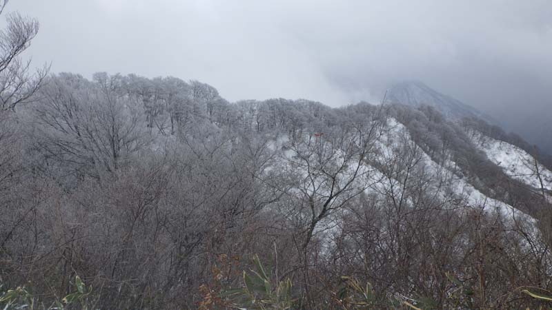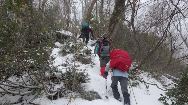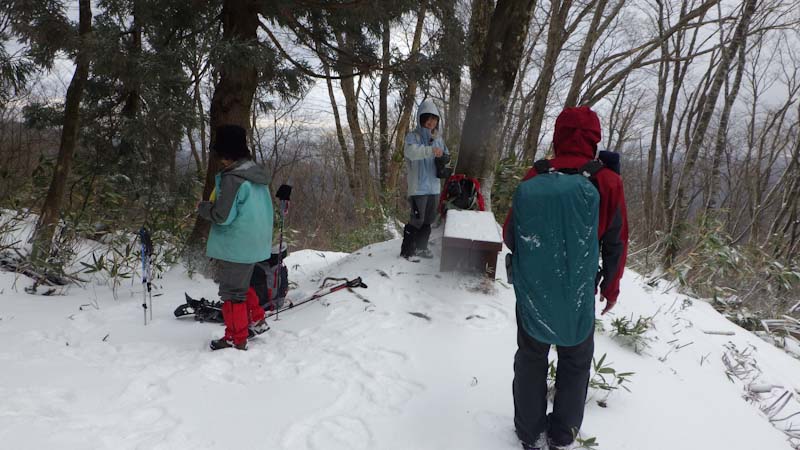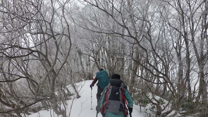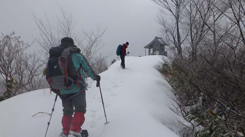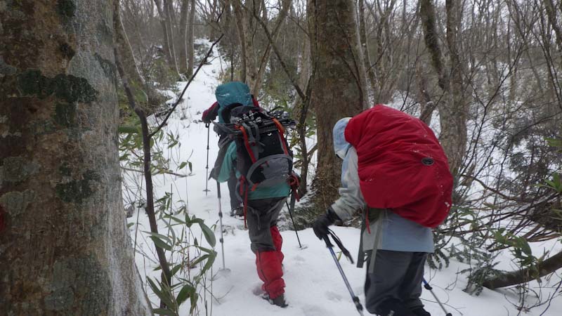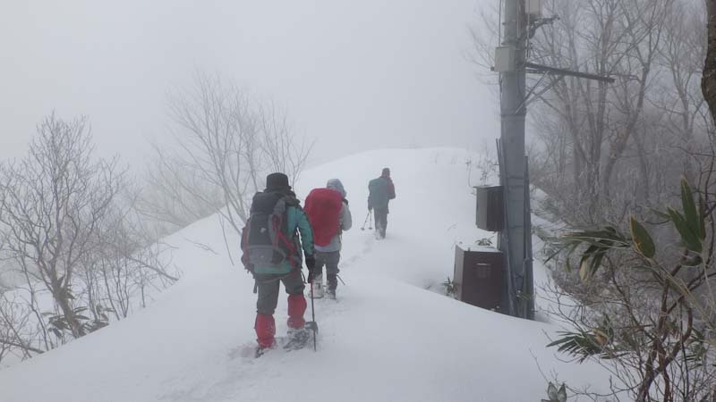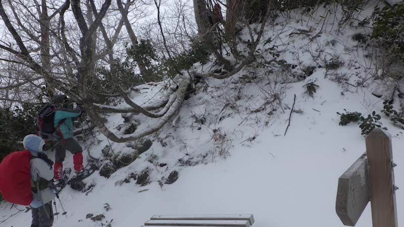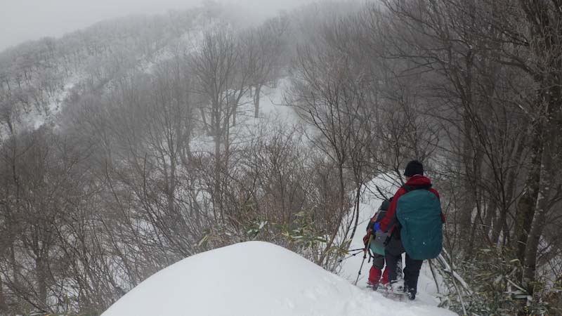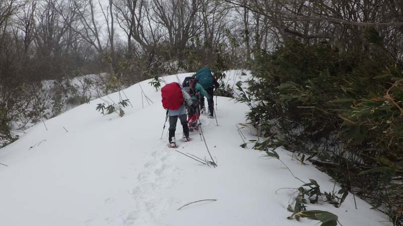 2/23 やはり山は雪だった。時には強く降ったりした。雪量の少なさは歪めないが、それでも雪山・冬山の雰囲気を充分に楽しんで来ました。 (私に合わせてくれた岩城君・マキちゃんに感謝!) 6合目からは、スノーシューでもカンジキでも充分使えます。