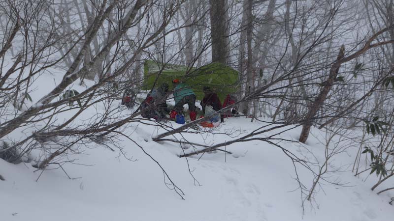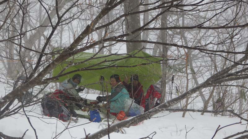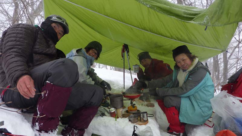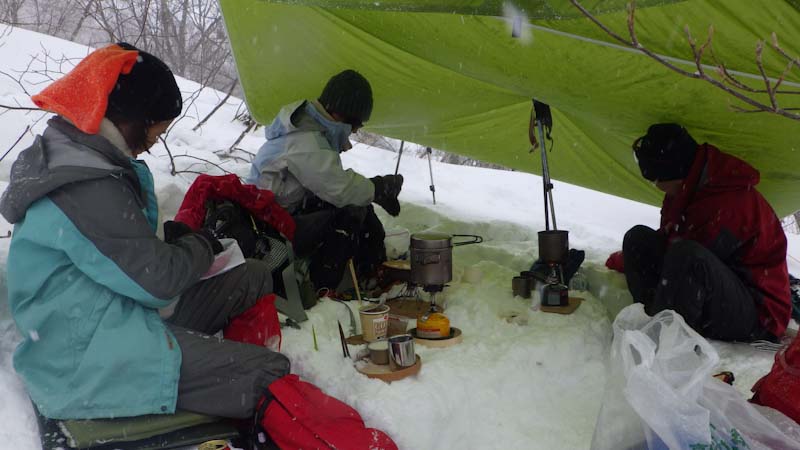雪が少ないのでベンチ・テーブル造りが上手くいかないし、タープを張っても風が強いと思うようにはいかない。でも、それなりの事が出来、また面白い。「滑った!」 「転んだ!」 「溢れた!」 「アチチ!」 何でも笑えるのである。